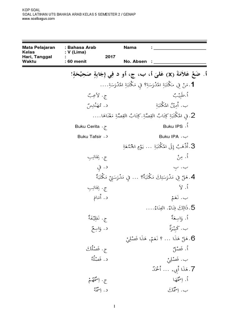 soal ini lengkap untuk semua jenjang mulai dari soal bahasa arab kelas 1 kelas 2 kelas 3 kelas 4 kelas 5 dan kelas 6 mi. Semua tersedia untuk kelas 1, kelas 2, kelas 3, kelas 4, kelas 5, kelas 6. Uts bahasa jawa kelas 5 semester 2 tahun 2016 bank soal uas uts. soal uas ganjil bahasa arab mi kelas 5 jawaban. Check spelling or type a new query.